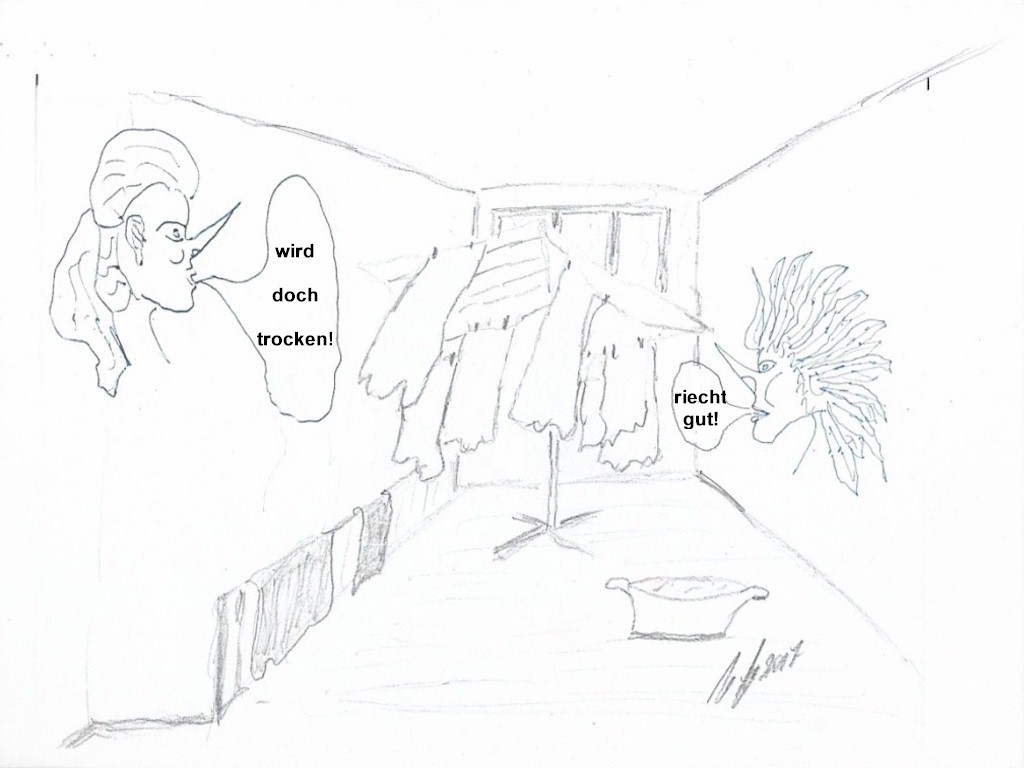 Da soll es ihnen egal gewesen sein, ob da ein Treppenhaus bei geschlossenen Flurfenstern und geschlossener Hof- und Haustüre, mit Waschpulverdüften durchzogen wurde und über diese Art und Weise alle Mitbewohner des Hauses mit großer Freude und sogar kostenlos zu einer Probe der Dünste der gewaschen und nun trocknenden Wäsche belästigt wurden. So sollen die beiden Wasch- und Trockenkünstler sich über die Auswirkungen ihres Einfalls und über ihre Umsetzung des außergewöhnlichen Wäschetrocknens sehr gefreut haben. Die Freude soll sehr groß gewesen und es soll der Vorgang als ein Späßchen ständig wiederholt worden sein.